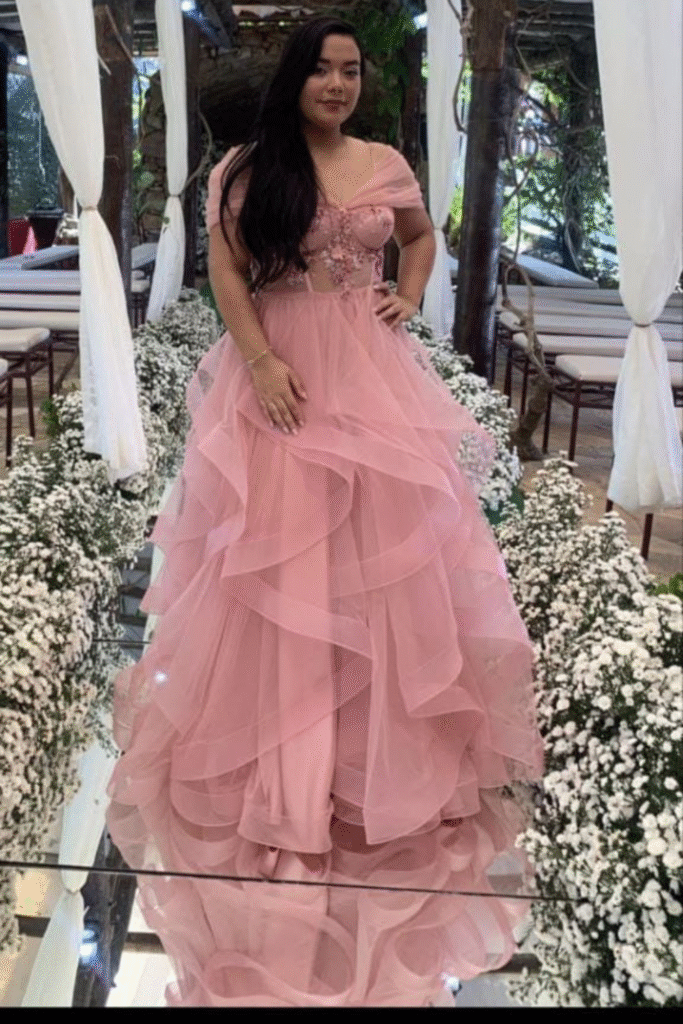 Este vestido rosa tem um design encantador e elegante, remetendo a um estilo de princesa. Ele conta com bordados delicados e pedrarias brilhantes. As mangas caídas adicionam um toque romântico, enquanto a saia volumosa em camadas de tule confere leveza e movimento. Perfeito para eventos glamorosos, bailes e festas temáticas.