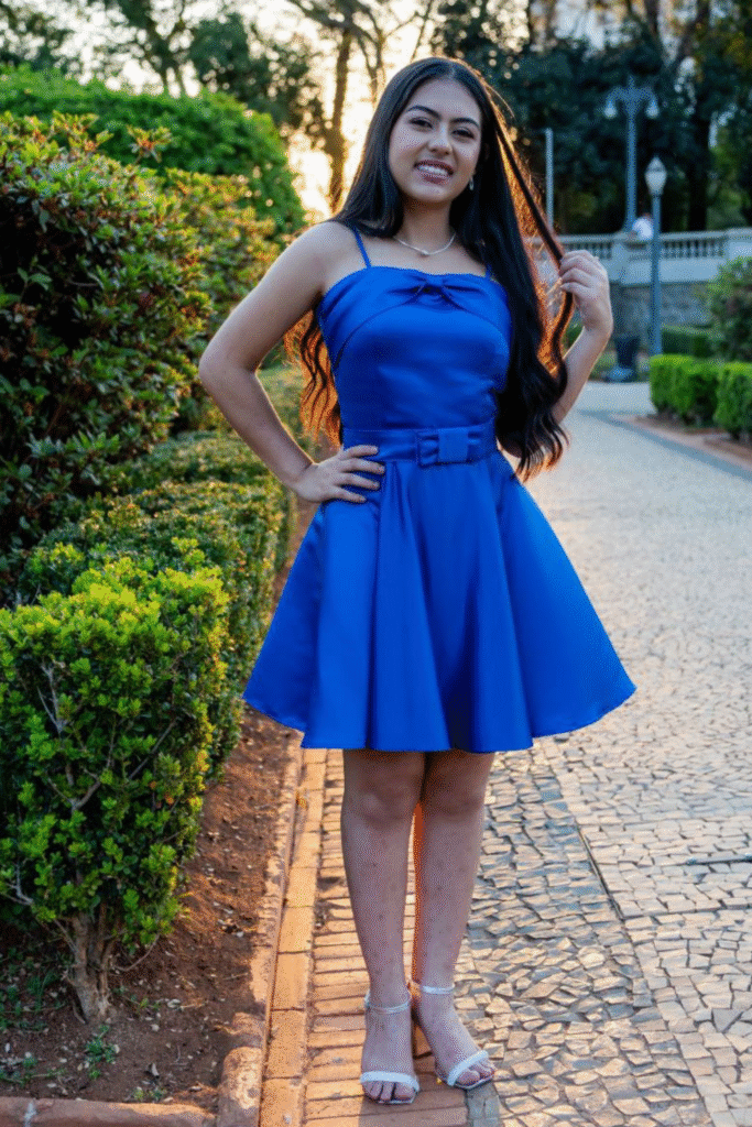 “Destaque-se em sua festa de debutante com nossa opção de locação de vestido curto azul royal com detalhes em laço. Com nossa seleção de estilos modernos e sofisticados, você vai se sentir como uma verdadeira fashionista em seu grande dia. Alugue agora e torne sua festa de debutante ainda mais inesquecível com um vestido deslumbrante!”