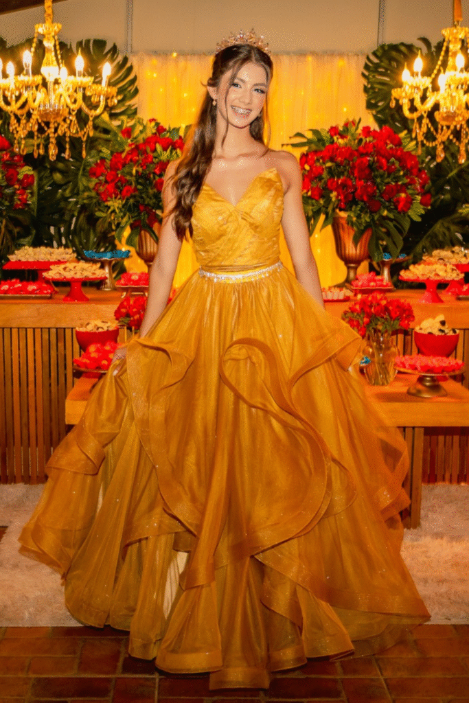 Encante-se com a sofisticação deste vestido Dourado estilo princesa. Brilhe como uma verdadeira princesa com este magnífico vestido de debutante dourado. O corpete ricamente drapeado detalhes em renda, enquanto a saia volumosa traz leveza e movimento. Um modelo perfeito para quem deseja um look glamouroso e inesquecível no grande dia.